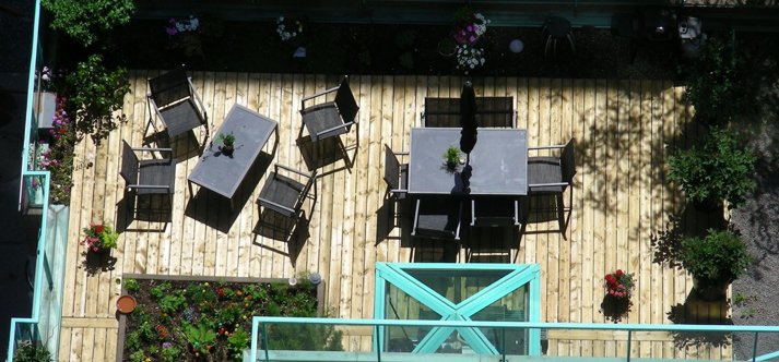 Enjoy walking up an in-suite spiral staircase with skylight, opening up to the 900 sq. ft. private landscaped terrace, surrounded by flowers! A great spot for morning coffee. The terrace offers a modern design set of table and chairs for six, as well as a informal seating area for four and barbecue.